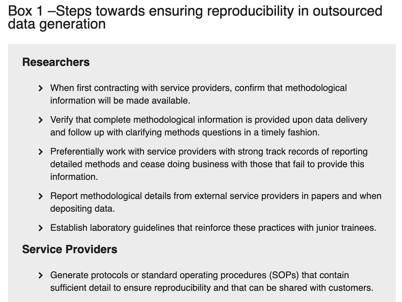"Big data" generated from outsourced or centralized facilities often lacks methodological information. Here, we outline how and why researchers, service providers, and other parties should report on methodology and sample metadata to improve scientific reproducibility.